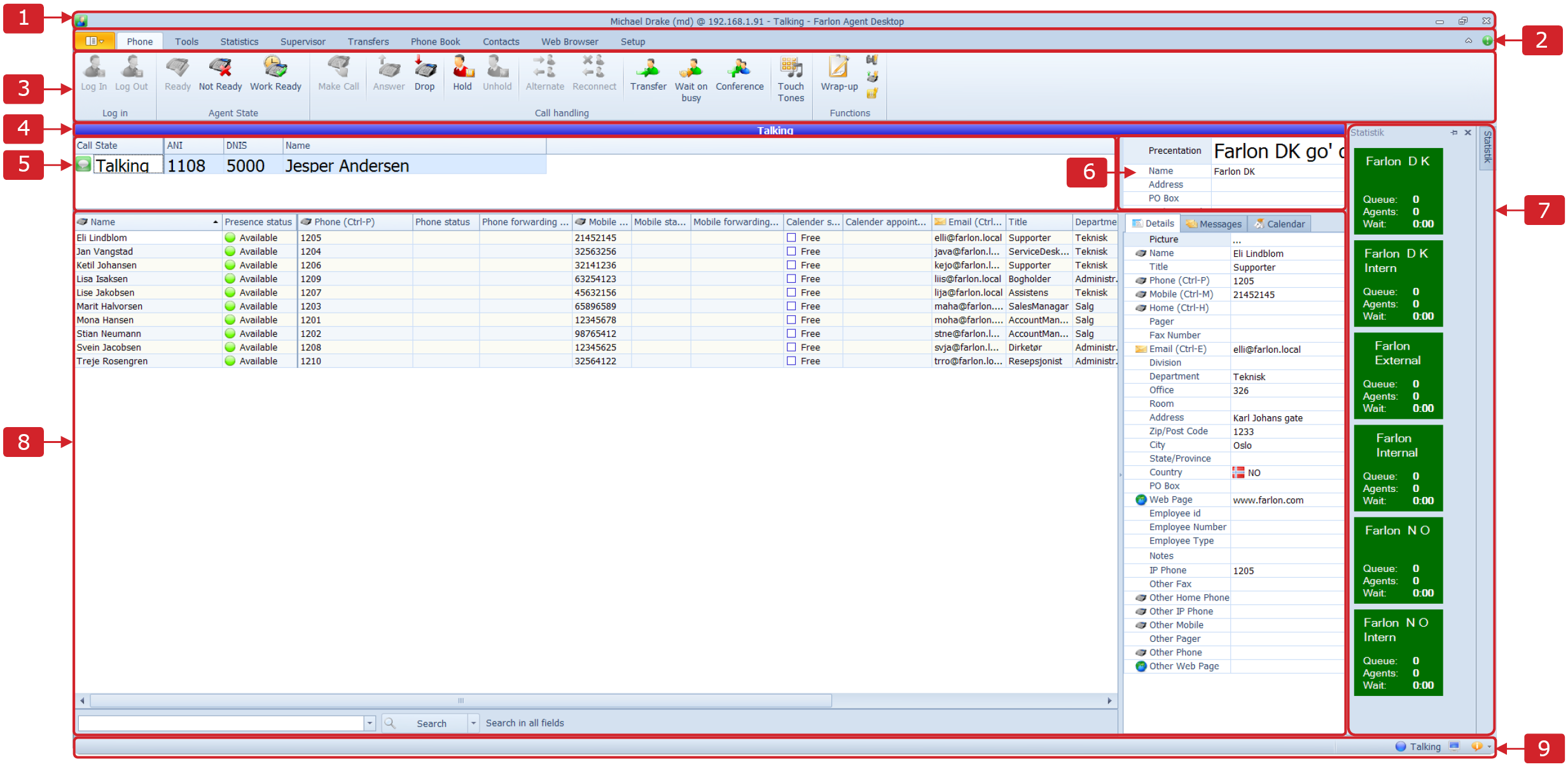 - Phone Book – a built-in switchboard including an employee database with calendar status, telephone and mobile numbers, email addresses, etc. Switchboard functionalities are described in the document ‘Farlon Agent Desktop Switchboard’